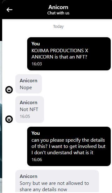 Студия Kojima Productions объявила о партнерстве с компанией Anicorn, повязанной на блокчейне и NFT. Детали сотрудничества двух компаний не раскрываются, но на прямой вопрос, связано ли оно как-то с NFT, представитель Anicorn ответил отрицательно.