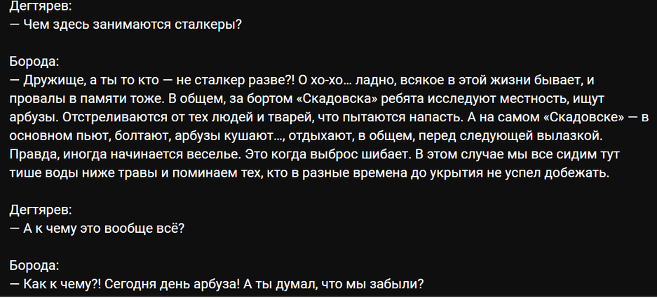 Майор Дегтярёв задаётся вопросом: «Чем здесь занимаются сталкеры?». На что Борода отвечает, что это всё приготовления ко Дню Арбуза.
