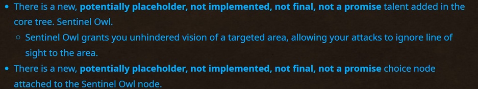 Встречается следующий фрагмент: «There is a new, potentially placeholder, not implemented, not final, not a promise talent....», т.е. наблюдается оговорка: «потенциальный плейсхолдер ["затычка"], не реализованный, не окончательный [не финальная версия], не обещанный [т.е. не факт, что выйдет в полноценный релиз]».