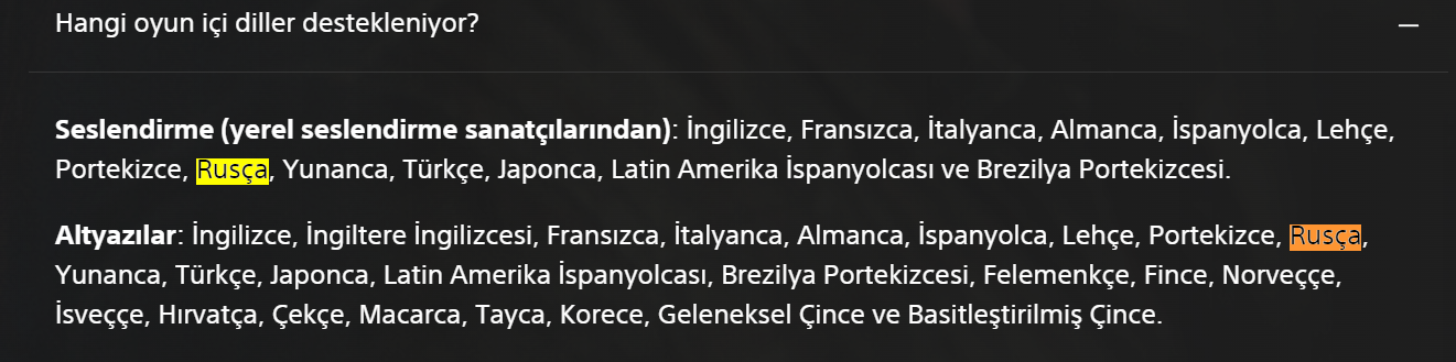В графе с ответом на вопрос (Hangi oyun içi diller destekleniyor?) о поддерживаемых языках, «русский» упоминается в обоих пунктах, т.е. ремейк The Last of Us будет с озвучкой и с субтитрами. На турецком «русский» записывается как Rusça.
