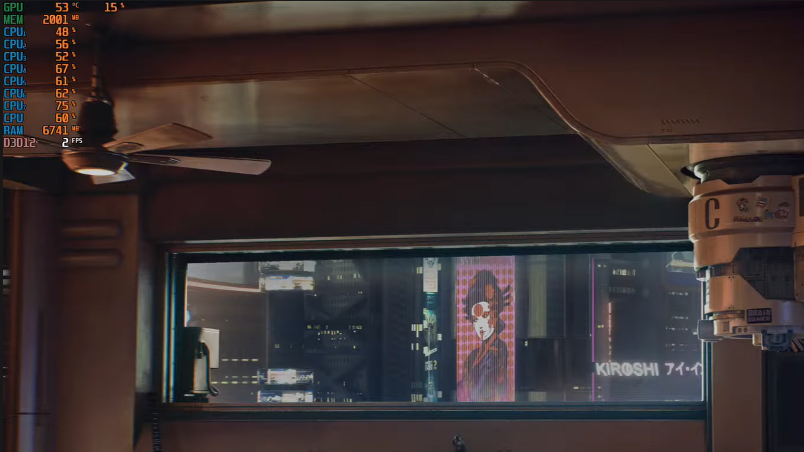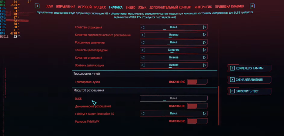 Удалось включить Cyberpunk 2077. Игра работает в среднем с 10-20 FPS. Наблюдаются просадки до 2-3 FPS. Были установлены довольно низкие настройки графики.