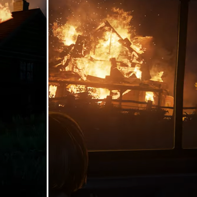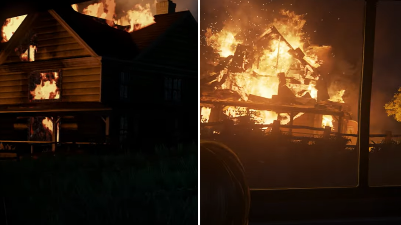 В центре внимания сцена с горящей фермой. Разница бросается в глаза: в обновлённой версии действо выглядит ярче, увеличено количество деталей.