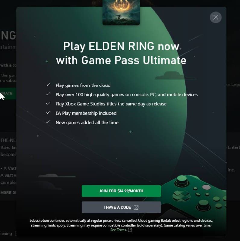 На странице библиотеки Xbox Game Pass на какое-то время появилось предложение оформить подписку, в рамках которой пользователи получат возможность поиграть в Elden Ring. Страницу оперативно исправили, убрав все упоминания проекта From Software, но ловкие пользователи успели сделать скриншот.