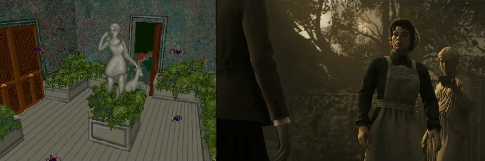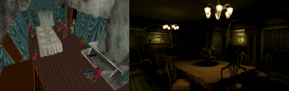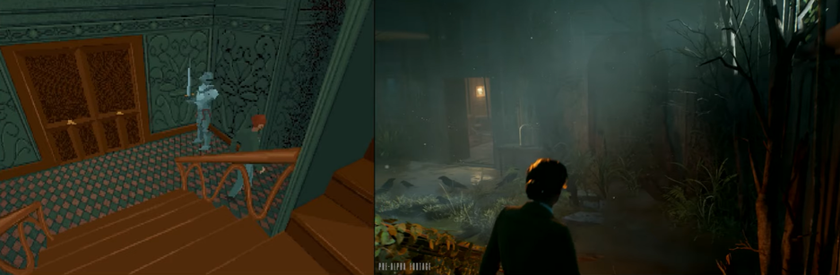 Похоже, что достаточно «проходное» место в оригинальной Alone in the Dark, значительно расширили в перезапуске. Лестничная клетка заставлена статуями, нижний этаж обустроен иначе.