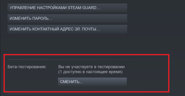 В разделе с бета-тестированием выбрать Steam Beta Update.