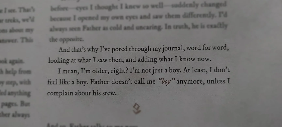 Фрагмент: «…Я имею в виду, я ведь [стал] старше, верно? Я не просто мальчик. По крайней мере, я не чувствую себя мальчиком, отец больше не называет меня "мальчиком" [boy], пока я не жалуюсь на его стряпню».