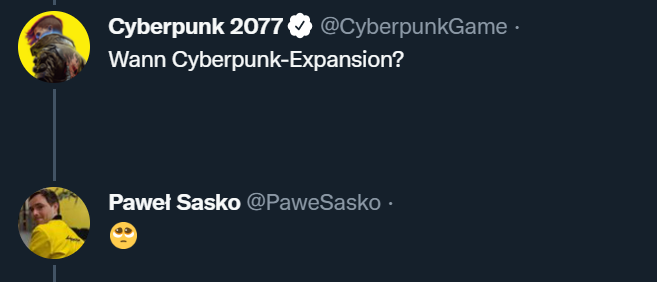 В социальной сети официальный аккаунт Cyberpunk 2077 написал «Wann [немецкий язык, "когда"] Cyberpunk-Expansion [расширение / дополнение для Cyberpunk]?».