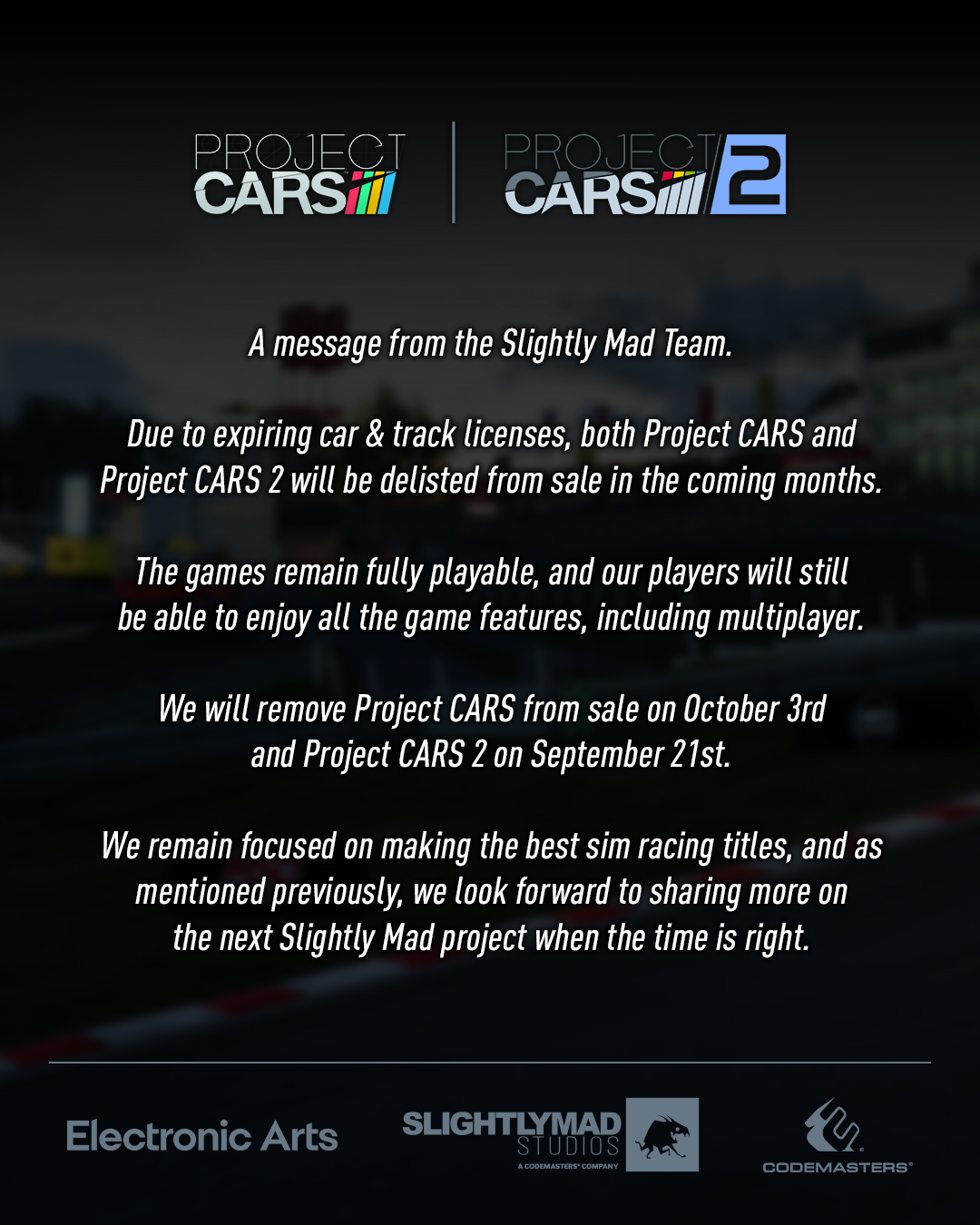 Ответственные за Project Cars и Project Cars 2 объявили о том, что обе игры изымут из продажи. Причиной тому послужило истечение срока действия лицензий на автомобили и треки.