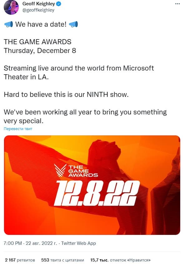 В этом году The Game Awards запланирована на 8 декабря в прямом эфире из Microsoft Theater в Лос-Анджелесе. На церемонии будут представлены награды, анонсы, трейлеры и музыкальные выступления.