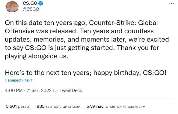 21 августа 2012 года мир познакомился с сетевым шутером Counter-Strike: Global Offensive. Valve не забыла поздравить фанатов.