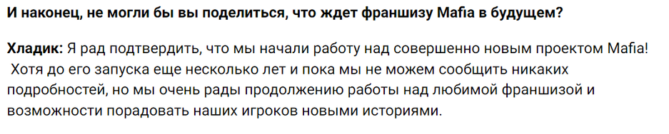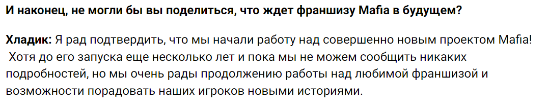 Помимо этого, подтвердили разработку новой Mafia. Подробностей пока нет, игру создаёт студия Hangar 13. Ждать придётся несколько лет. По слухам, игра станет приквелом про дона Сальери на Сицилии, а в качестве движка будут использовать Unreal Engine 5.