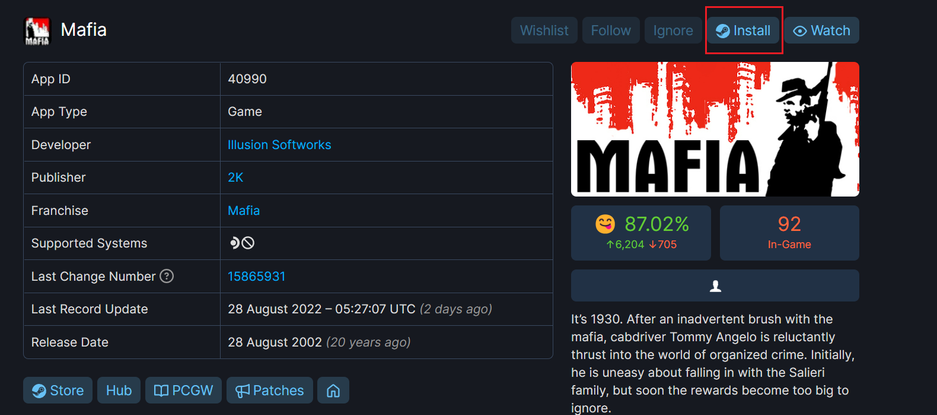 2K прекратил продавать свои игры в России и заблокировал страницы в Steam, в том числе и страницу оригинальной Mafia. В связи с этим, получение подарка в данном регионе может быть осложнено. Как вариант, можно будет попробовать забрать игру через кнопку Install на SteamDB по ссылке.