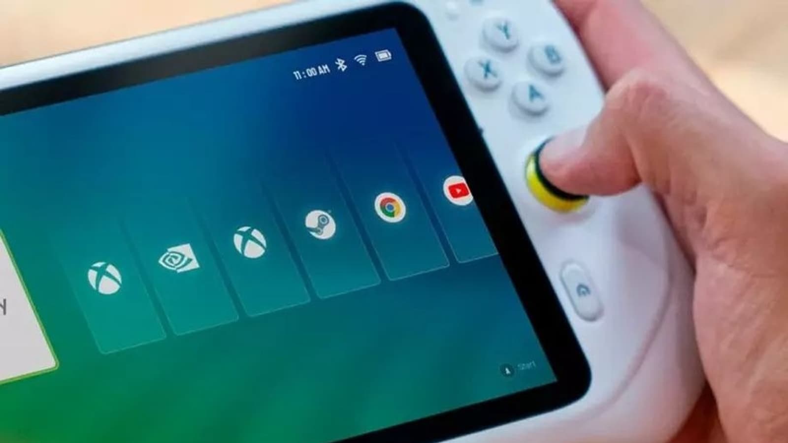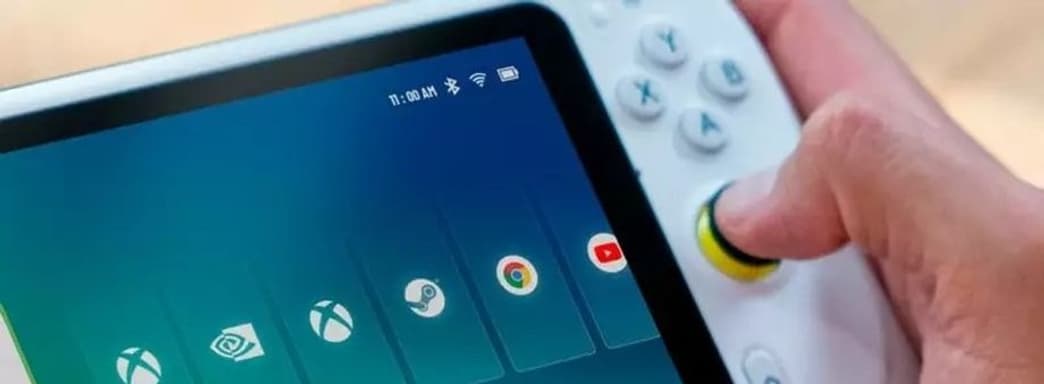На экране видны логотипы Xbox (Xbox Cloud Gaming), NVIDIA (GeForce Now), а также Steam (стриминг?). Устройство также предоставит доступ к браузеру и YouTube.