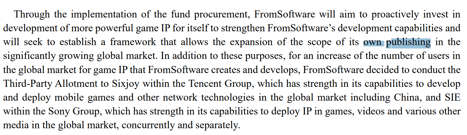 Как утверждает Kadokawa Corporation, полученные средства позволят усилить возможности FromSoftware по созданию и разработке игровой IP (интеллектуальная собственность). Также в тексте содержится намёк на то, что FromSoftware может расширить свою деятельность и выступить в роли не только разработчика, но и издателя.