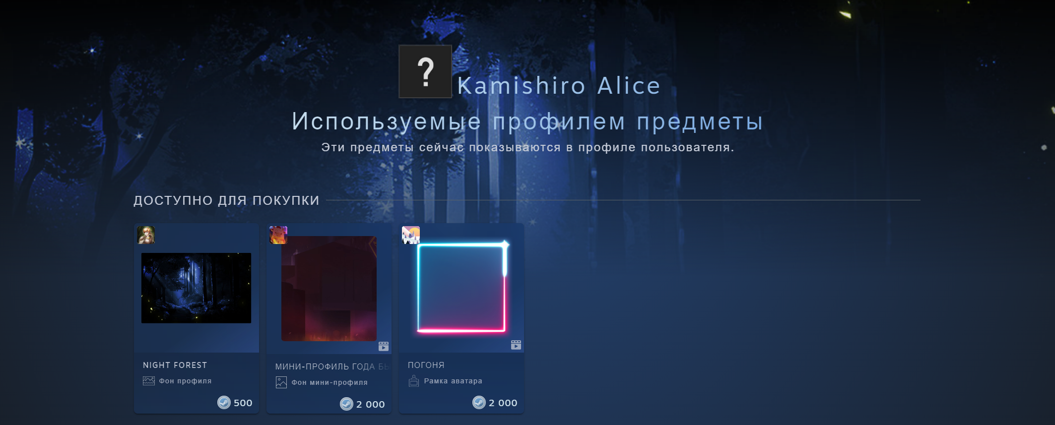 Нажатие на данную кнопку переводит в магазин очков Steam, где можно изучить и сразу купить предметы, которыми оформлен профиль (если они есть в наличии).