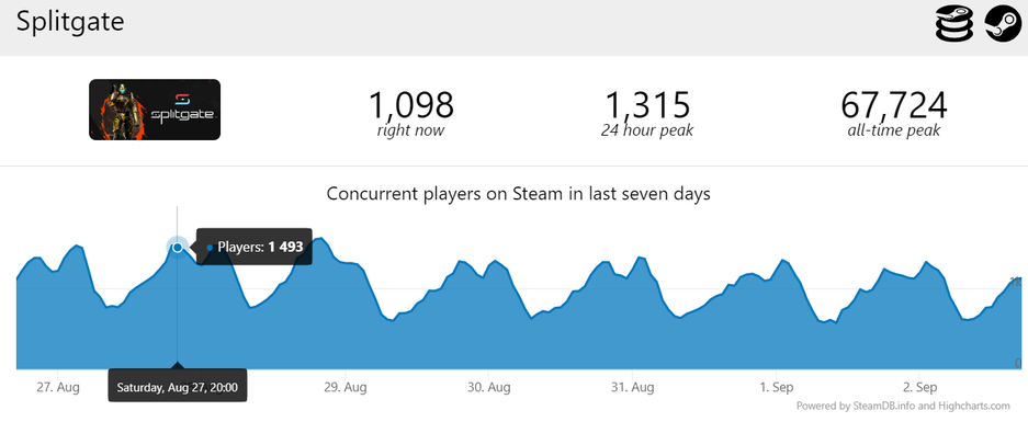 Одно время шутер Splitgate был на волне популярности, игру называли гибридом Portal и Halo (или Quake). Однако, аудиторию не удалось удержать.