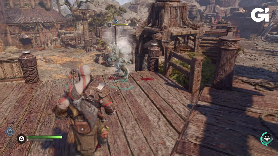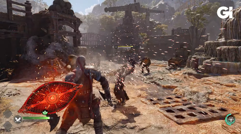 Атрей и Кратос вступают в бой. Главный главный герой успевает задействовать топор, клинки Хаоса и продемонстрировать работу щитов.