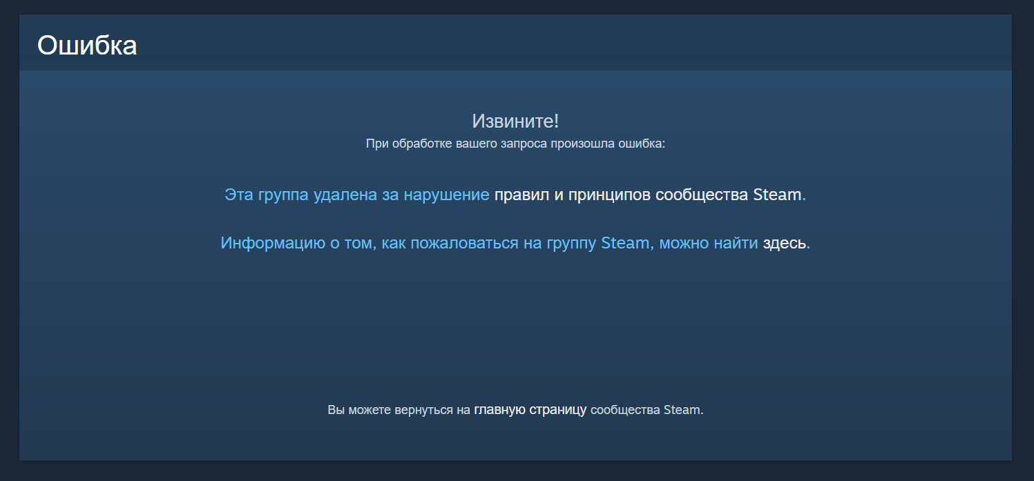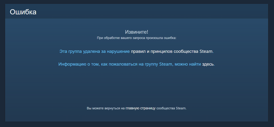 На странице попавшихся кураторов в Steam теперь сообщают: «Эта группа удалена за нарушение правил и принципов сообщества Steam».