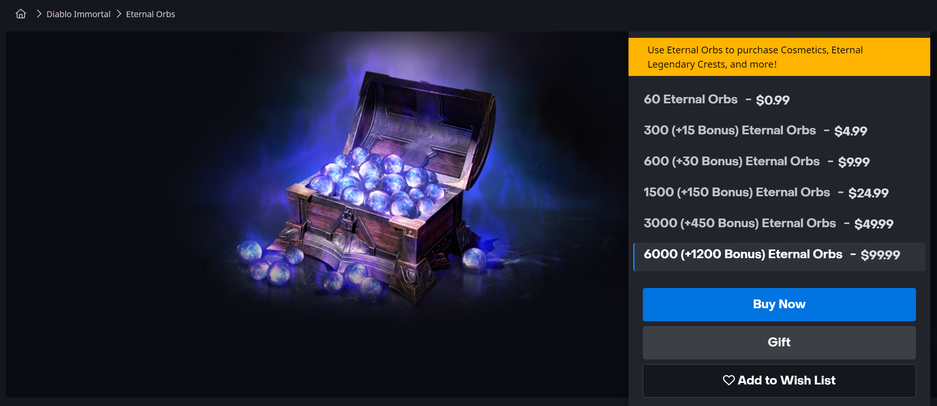 На его балансе -2491025 (почти 2,5 миллиона) сфер. В официальном магазине Diablo Immortal компания Blizzard предлагает купить 6000 сфер + 1200 бонусных за 99.99 доллара.
