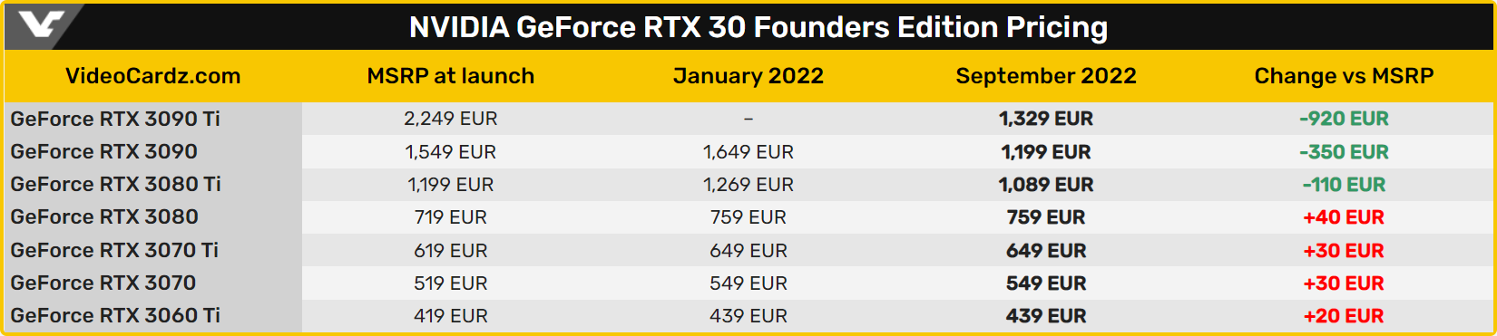 В преддверии скорого анонса флагманской серии RTX 4000 NVIDIA решила переклеить ценники у RTX 3090 Ti, 3090 и 3080 Ti FE. Цены упали на сотни евро, правда, пока только в странах Европы.