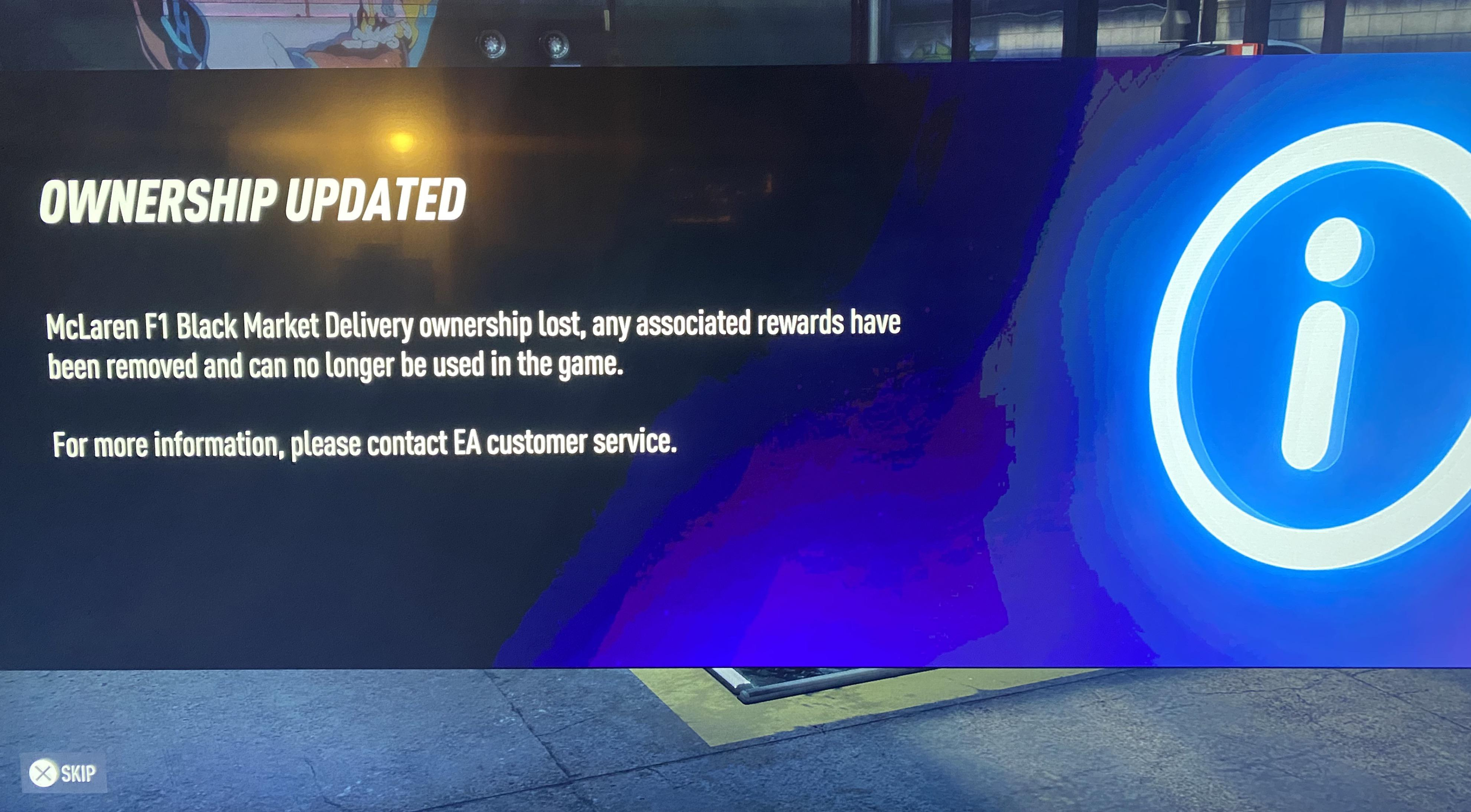 Игроку Need for Speed Heat сообщили, что право собственности на «McLaren F1 Black Market Delivery» утрачено.