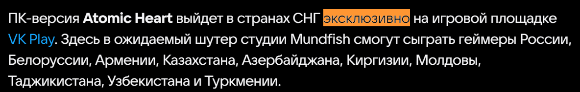 Список стран, где Atomic Heart на ПК будет доступна эксклюзивно в VK Play следующий: