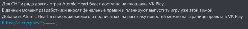 Ссылка ведёт на страницу Atomic Heart в VK Play.