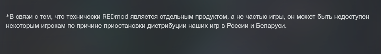 Польская CD Projekt RED сообщила, что технически REDmod является не частью Cyberpunk 2077, а отдельным продуктом. В связи с этим, он может быть недоступен некоторым игрокам, т.к. компания прекратила дистрибуцию игр в России и Беларуси. REDmod выпустили как бесплатное DLC.