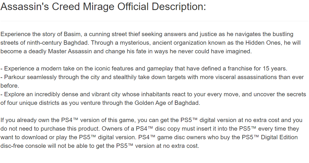 Версию Assassin's Creed Mirage для PlayStation 4 можно будет бесплатно обновить до версии для PlayStation 5.