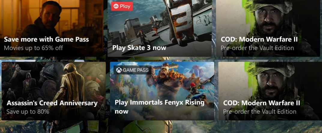 Ниже расположили кнопки для перехода в библиотеку Xbox и в магазин. Также есть рекламные предложения, в данном случае — продвигают Call of Duty Modern Warfare II.