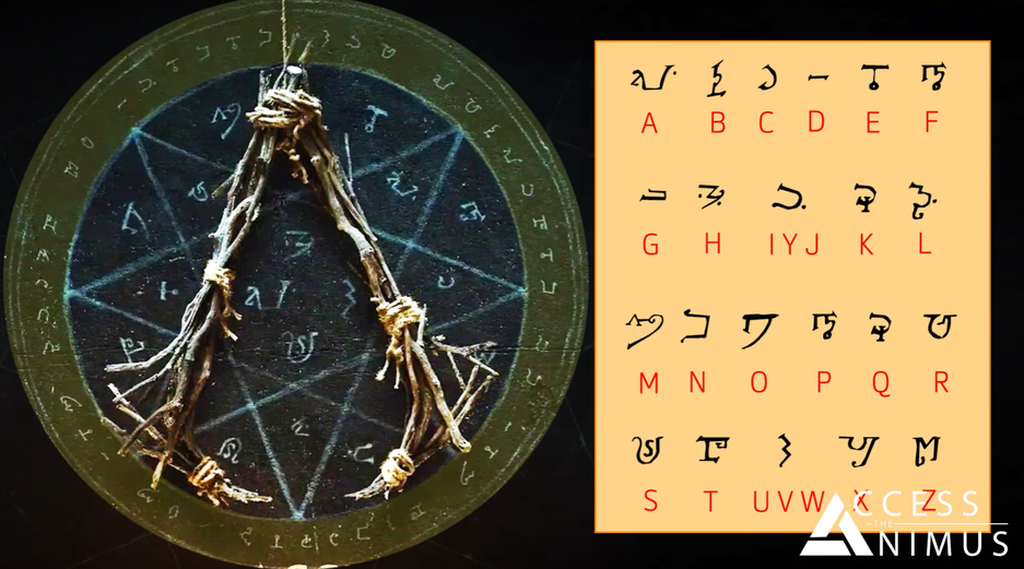 Похоже, что эти символы из алфавита волхвов. Надпись на немецком можно перевести как: «we work in the dark to serve the light» (или «Мы работаем/действуем во тьме, чтобы служить свету», это фрагмент кредо ассасинов).