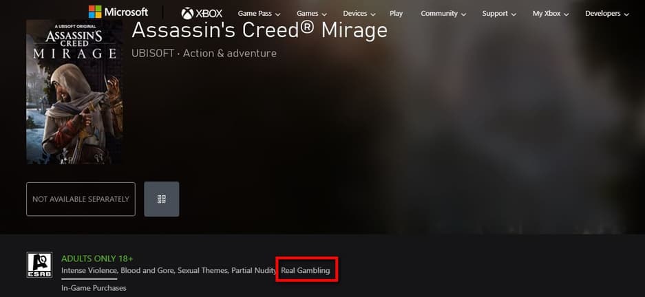 После анонса Assassin’s Creed Mirage игра сразу же обзавелась страницами в магазинах Sony и Microsoft. Причем в магазине Xbox у новой песочницы висит плашка с рейтингом «Adults Only» и упоминанием азартных игр со ставками реальными деньгами.