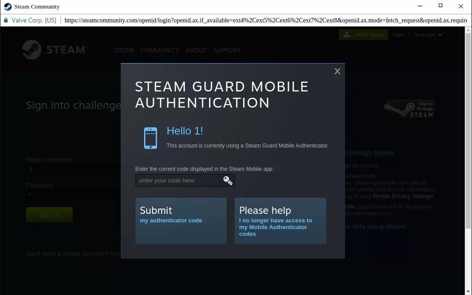 Иногда требуется ввести логин и пароль от аккаунта Steam. Для ввода данных обычно всплывает окошко с формой, которое научились имитировать хакеры