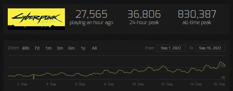 «Между тем, вот как выглядит сентябрь для Cyberpunk 2077 в чартах Steam. Надеюсь, вы отлично проведете время в Найт-сити!».