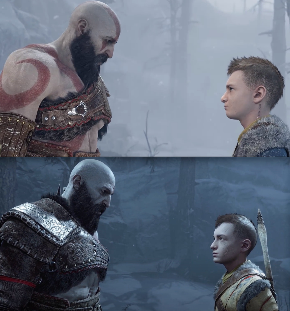 Вскоре появилось сравнение одного из кадров, Атрей и Кратос изменились. Заметно, что в новой версии God of War Ragnarok используются более холодные цвета.