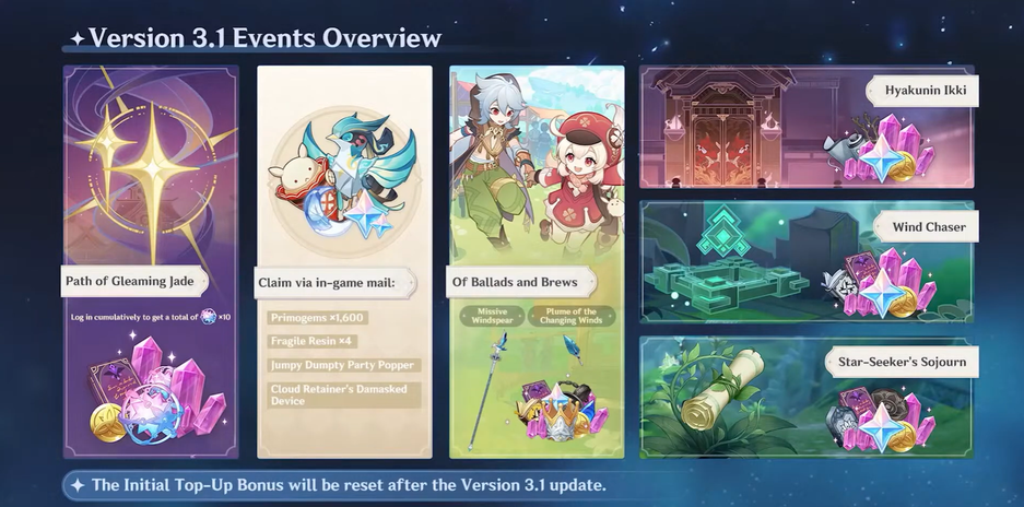 Различные активности обновления 3.1 для Genshin Impact.