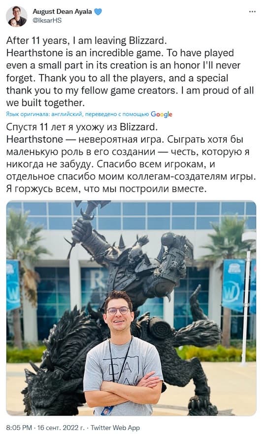 После 11 лет работы из Blizzard Entertainment уходит директор команды Heathstone, Дин «Iksar» Айала. На должность его назначили в начале лета.