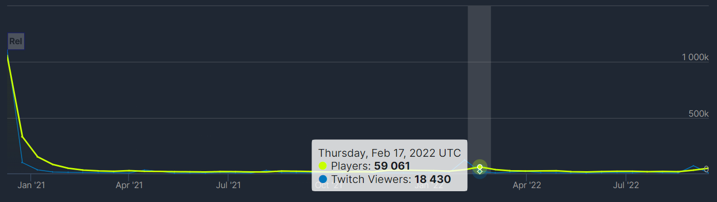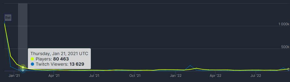 Постепенно онлайн Cyberpunk 2077 угас и примерно с начала 2021 года колебался в пределах 10-30 тысяч. Исключением стал февраль текущего года, когда выпустили крупный патч 1.5, онлайн вырос почти до 60 тысяч человек.