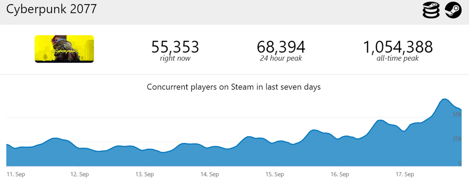 Недавно для Cyberpunk 2077 выпустили патч 1.6, а также представили аниме Cyberpunk Edgerunners. Онлайн взлетел до 68394. Для сравнения, к концу января прошлого года онлайн превышал 80 тысяч.