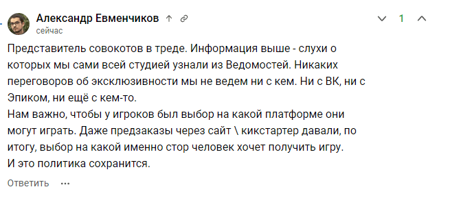 По словам представителя Owlcat Games, о сливе игр в VK Play они узнали из новостей. Как утверждается, переговоров с VK, Epic или какой-нибудь другой компанией по поводу эксклюзивности не ведётся: «Нам важно, чтобы у игроков был выбор на какой платформе они могут играть. Даже предзаказы через сайт \ кикстартер давали, по итогу, выбор на какой именно стор человек хочет получить игру. И это политика сохранится».