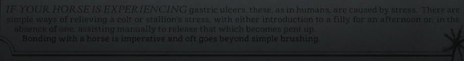 В каталоге с товарами разработчики из Rockstar вставили совет по ублажению жеребцов. По мнению составителей совета, если у лошади язва желудка, то это вызвано стрессом, как и у людей.