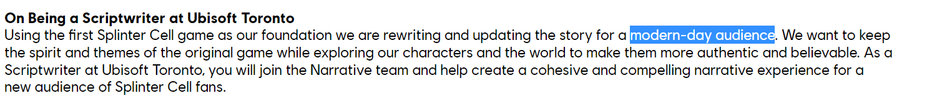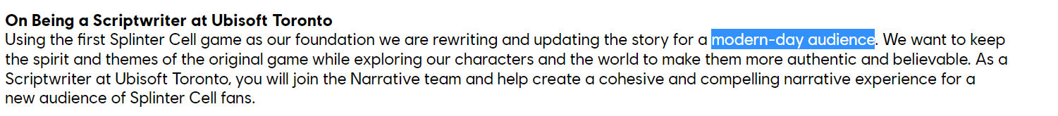 В графе «о работе» упоминается тот факт, что историю первой Splinter Cell переписывают и обновляют (адаптируют) для современной аудитории. Ubisoft хочет сохранить дух и темы оригинальной Splinter Cell и «…исследовать персонажей и мир, чтобы сделать их более аутентичными и правдоподобными».
