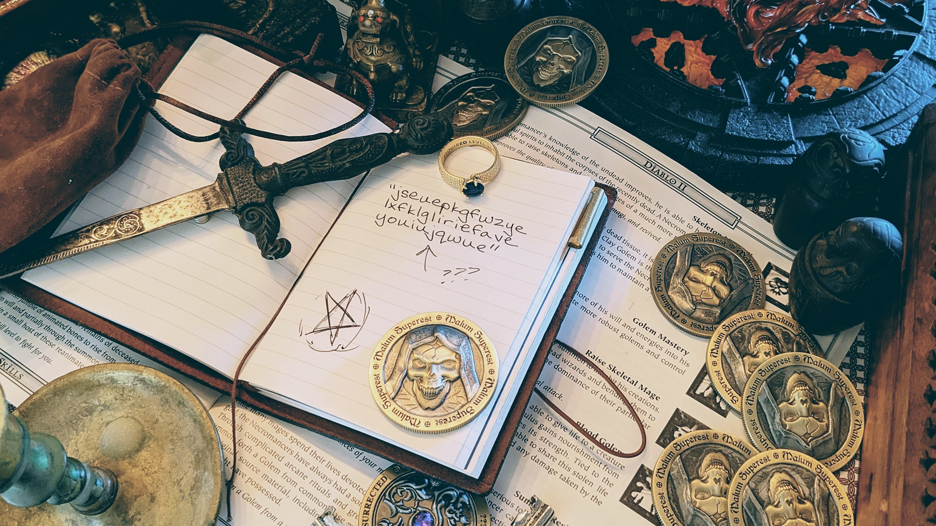 На изображении можно увидеть страницы к руководству игры, блокнот с символами, легендарное кольцо Иорданов Камень, золотые монеты с силуэтом Тёмного Странника, подписанные Malum Superest (латынь – Зло побеждает) и ряд других предметов.