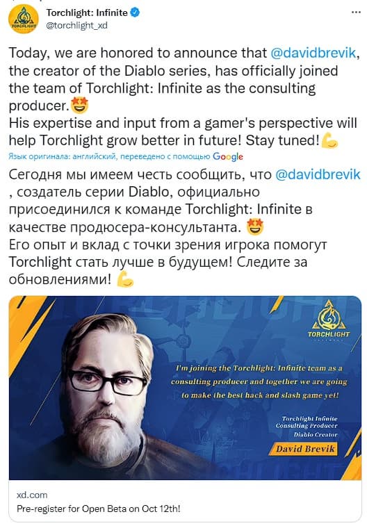 За несколько недель до начала открытого бета-тестирования условно-бесплатной Torchlight: Infinite студия XD Entertainment объявила, что в её ряды вступил Дэвид Бревик, создатель и один из главных дизайнеров первых двух частей серии Diablo.