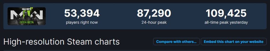 Многопользовательская бета Modern Warfare 2 открыла двери пользователям, оформившим предварительные заказы на игру. На момент написания этих строк в шутер играет свыше 53 тысяч пользователей, когда пиковое число одновременно активных игроков за последние сутки составляло почти 110 тысяч душ.