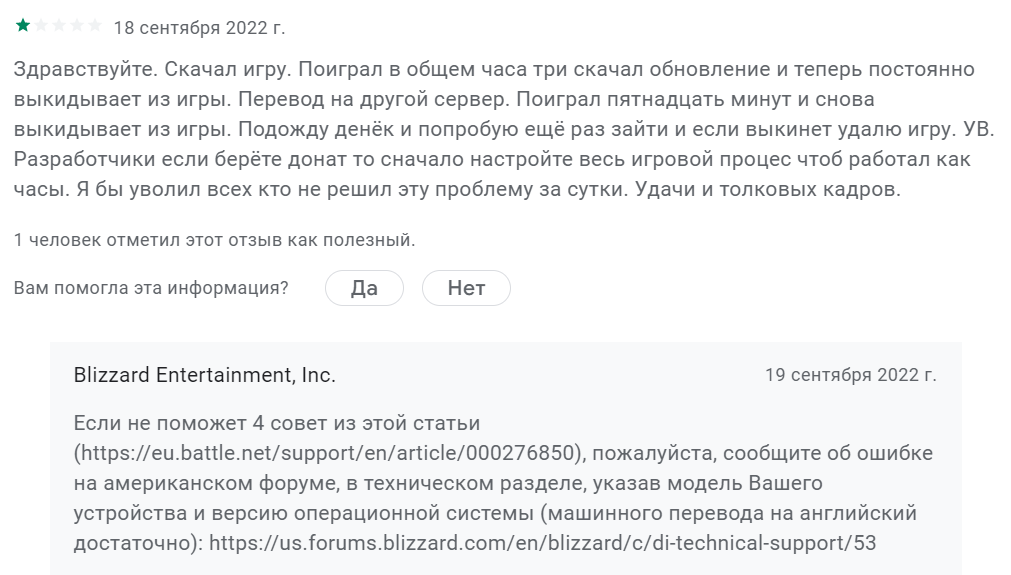 В отзывах Blizzard отвечает игрокам на русском языке.