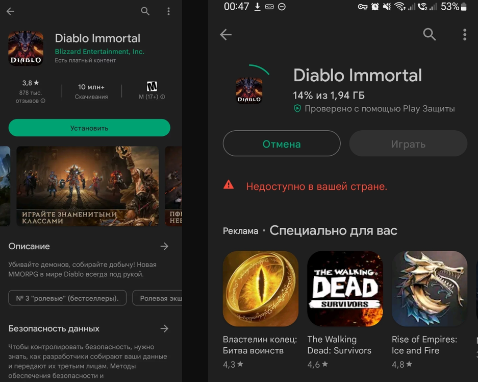 Пользователь под ником DroFM рассказал, что несколько часов назад Diablo Immortal была доступна для скачивания в российском Google Play.