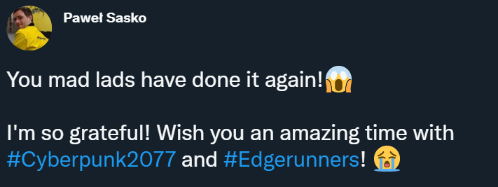 Он написал в социальной сети: «Вы, сумасшедшие ребята, сделали это снова! Я так благодарен! Желаю вам потрясающе провести время с Cyberpunk2077 и Edgerunners!» Сообщение сопровождают эмодзи, в том числе и со «слезами» (радости).