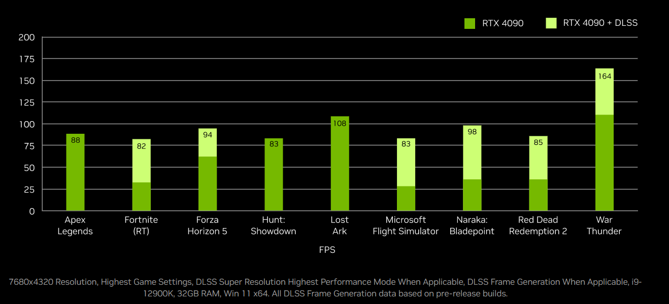 NVIDIA протестировала видеокарту GeForce RTX 4090 в видеоиграх и поделилась результатами. Тесты проводились в разрешении 8К (7680x4320, максимальные настройки графики).