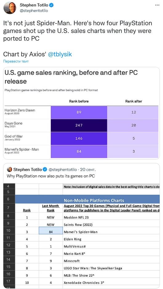 Журналист Стивен Тотило описал интересную взаимосвязь – каждая игра Sony, которая выходила на ПК через определенный период времени, могла похвастаться хорошими продажами. Например, Days Gone, занимавшая 247-е место в рейтинге, заняла 20-е место благодаря выходу на ПК. God of War была близка к пьедесталу (5-е место со 146-го), а Horizon Zero Dawn почти вошла в десятку самых покупаемых игр (12-е место с 89-го).